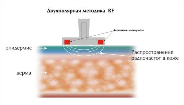 - Биполярный. Более щадящая технология. С помощью переключения полярности достигается снижение температуры до 45 градусов. Благодаря этому биполярный РФ лифтинг может применяться для воздействия на деликатные проблемные зоны. В этом режиме отсутствует магнитное поле.