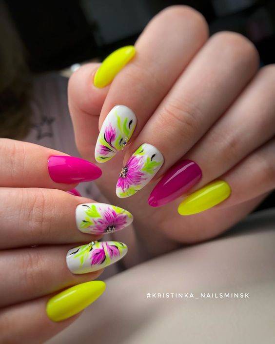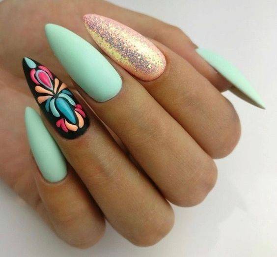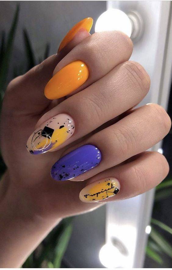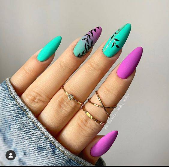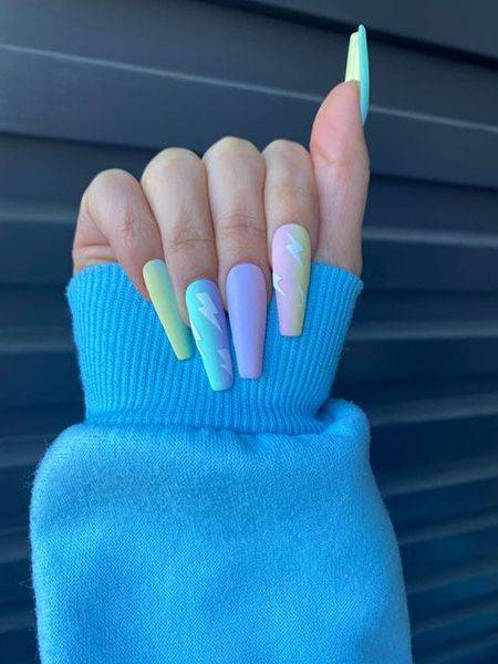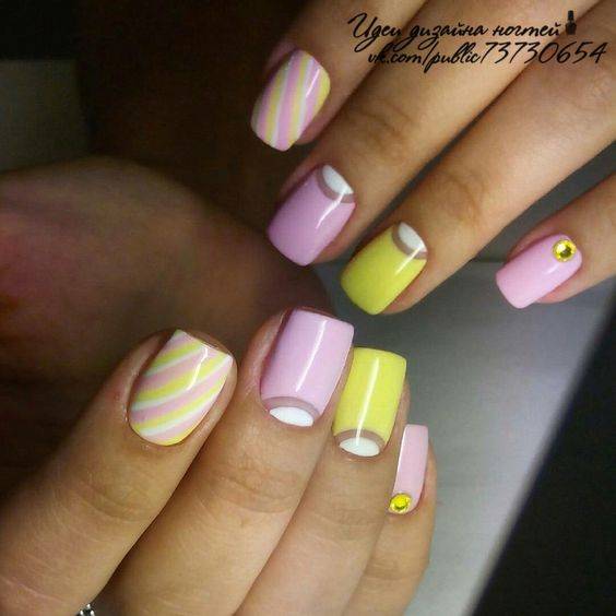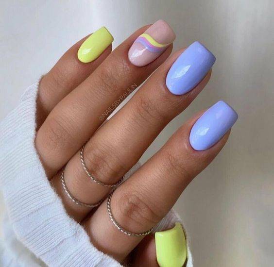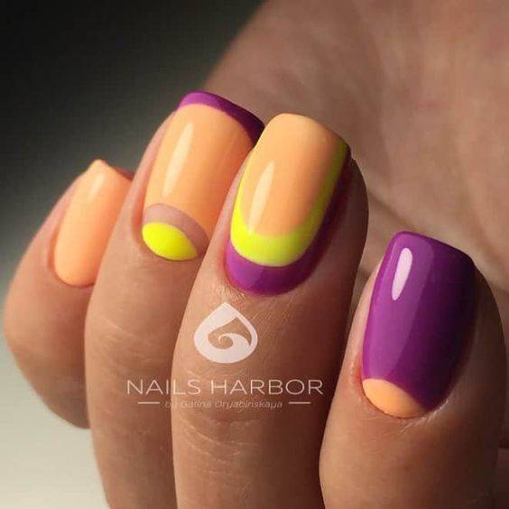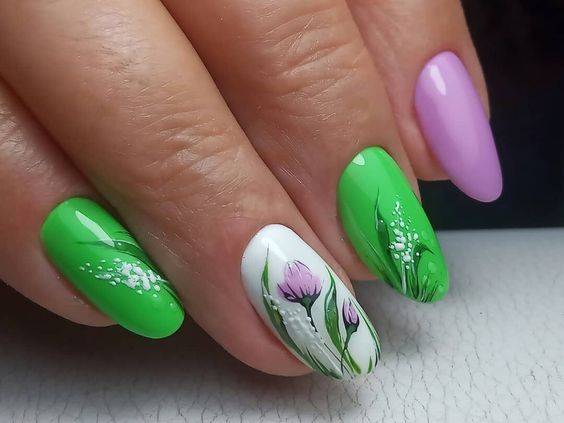 Разноцветный ногтевой дизайн – хороший вариант для весны, когда природа возрождается заново. Можно удачно комбинировать между собой такие цвета, как лаймовый, салатовый, розовый, фиолетовый, сиреневый.