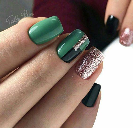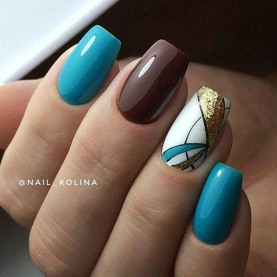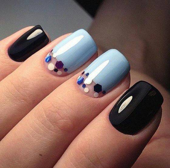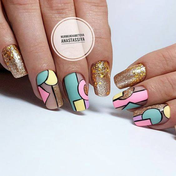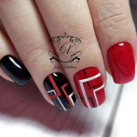 Замысловатые украшения с модными полосками и блестками или маникюр, выполненный с использованием негативного пространства, отлично смотрятся на квадратном маникюре. Геометрические рисунки также могут визуально удлинить короткие квадратные ногти, придав им более изящную форму.