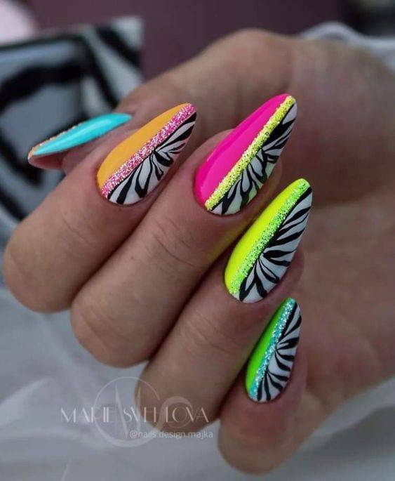 Вы на финишной прямой, и остались небольшие завершающие штрихи. Чтобы ваш стильный дизайн ногтей смотрелся еще ярче, вы можете нанести слой лака с мелким глиттером. Небольшие блестки добавят в маникюр мерцающий эффект, который отлично дополнит такой летний нейл-арт в 2014 году. Не забывайте нанести топовое покрытие, чтобы ваши яркие ногти радовали вас как можно дольше.