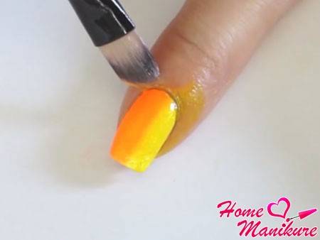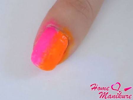Далее промакивающими движениями нанесите первый радужный слой на ноготь. Учитывая, что композиция на ногтях будет цикличной, не забывайте, что розовый цвет должен смотреть в сторону мизинца, а оранжевый – в сторону указательного пальца.