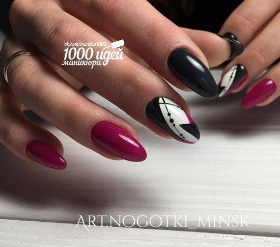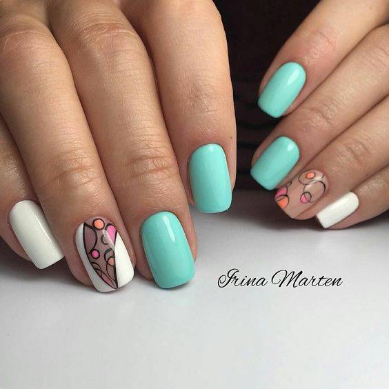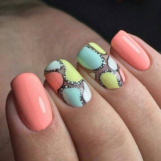 Броская абстракция завоевала списки модных трендов не только в фэшн-индустрии, но и в мире маникюра. Не бойтесь сочетать красочные оттенки и яркий декор. Тандем белого горошка, космических разводов и разнообразных линий — все это смотрится круто и новомодно. С таким дизайном вы будете выглядеть суперстильно и молодежно.