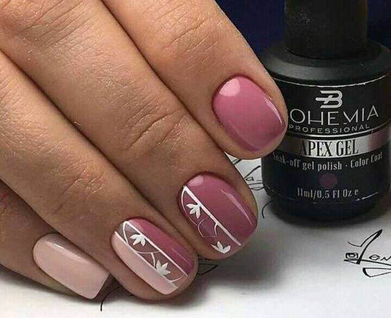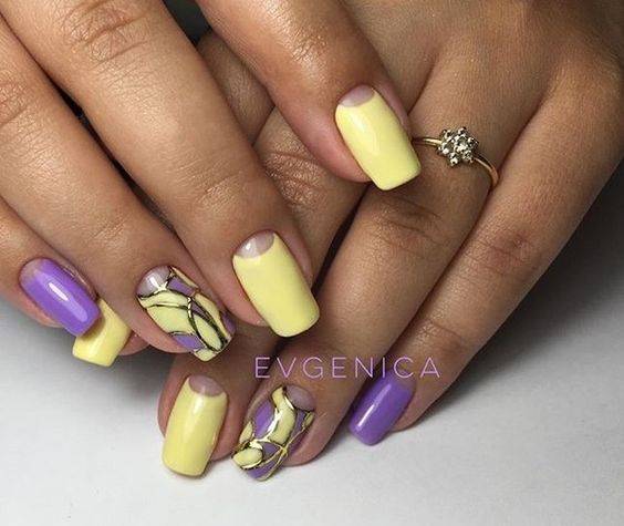 При создании дизайна обратите внимание, что в качестве основы следует выбирать самый светлый оттенок гель-лака. Отличным вариантом станет подложка лимонного цвета. Сверху ногти покрывают серым, оранжевым и розовым гель-лаком