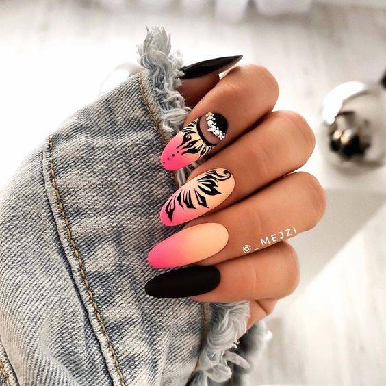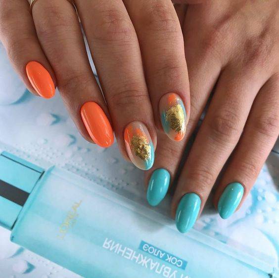 Сверху ногти покрывают серым, оранжевым и розовым гель-лаком. Для более яркого эффекта можно сверху нанести прозрачный блестящий слой.