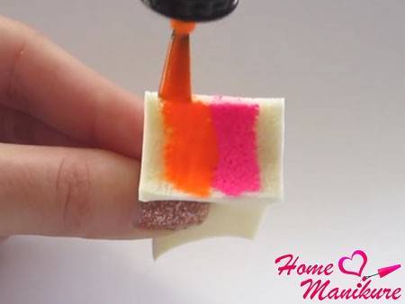 Приготовьте пять кусочков спонжика или обычной губки – по одному для каждого ногтя. Начинать нашу композицию мы будем с большого пальца руки. Возьмите спонж и плотным слоем нанесите на него две вертикальных полоски – розового и оранжевого цвета.