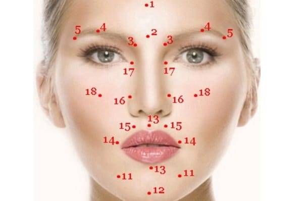 Лицо — средоточие активных точек (более 114). Диаметр каждой колеблется в зависимости от физиологических особенностей — от 1 мм до 1 см. Если говорить проще, то их карта — совокупность нервных придатков, воздействие на которые вызывает ломоту, слабую боль и легкие «разряды тока».