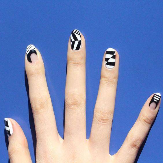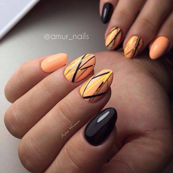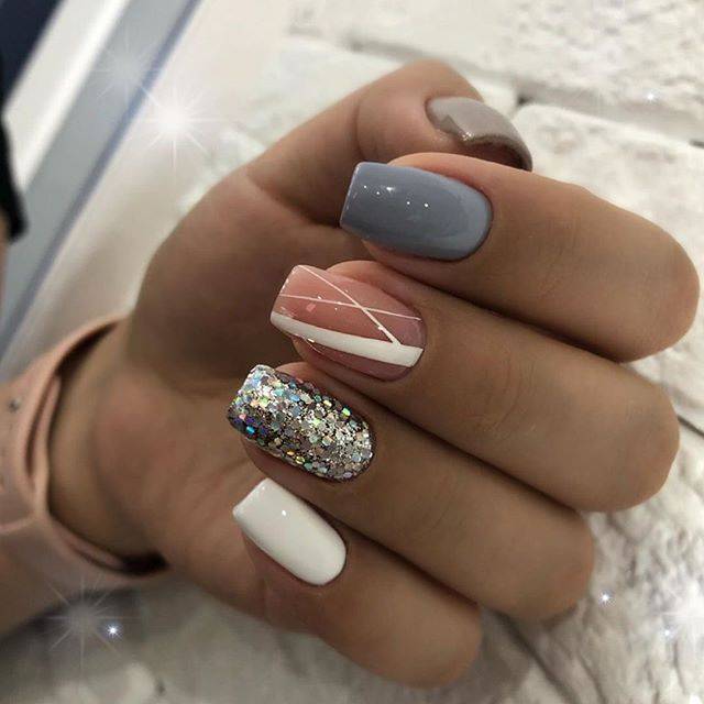 Оригинально смотрятся в таком направлении комбинированные рисунки, когда на одной ногтевой пластине интересно сочетаются полосы и графические узоры. Также можно оформить подобную идею с использованием блестящих акцентов, например, фольги или глиттера, которые могут выступать в качестве красивой подложки или принимать участие в формировании самого абстрактного изображения