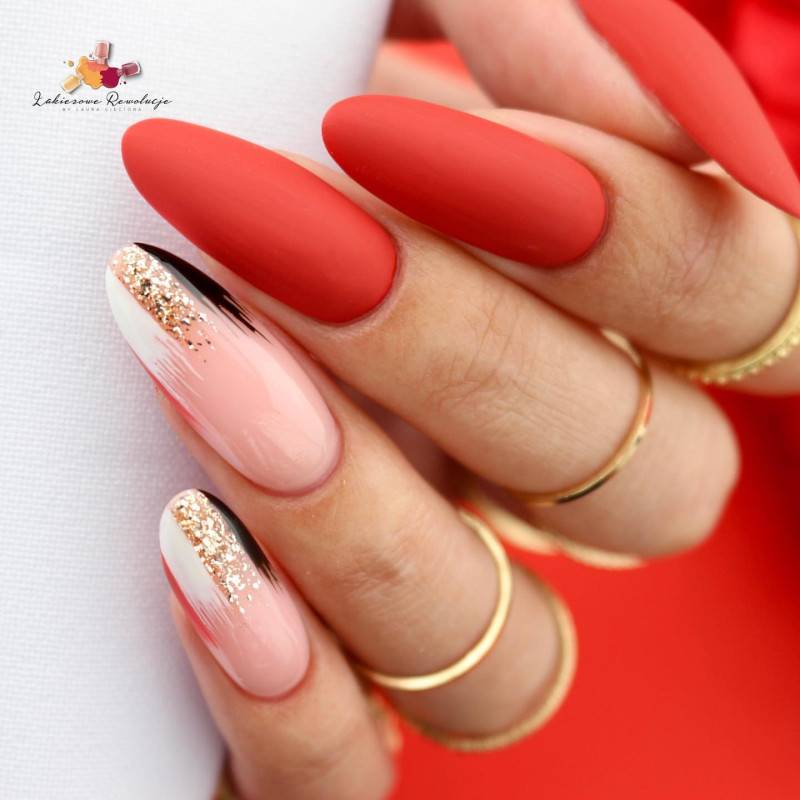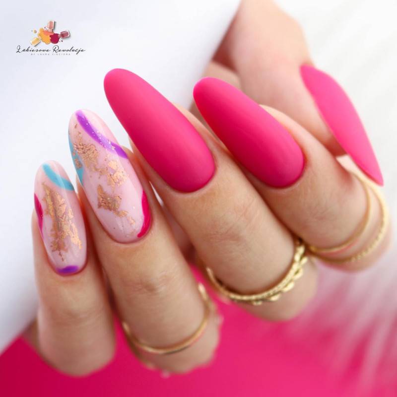 Вы можете выделить пару ноготков яркими мазками, разноцветными брызгами или потёками. Оригинально смотрятся в таком направлении комбинированные рисунки, когда на одной ногтевой пластине интересно сочетаются полосы и графические узоры. Также можно оформить подобную идею с использованием блестящих акцентов, например, фольги или глиттера, которые могут выступать в качестве красивой подложки или принимать участие в формировании самого абстрактного изображения.