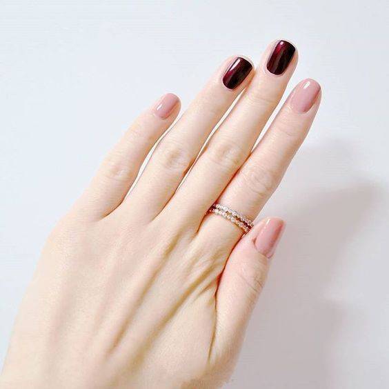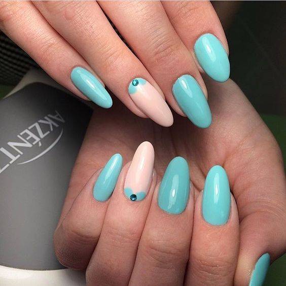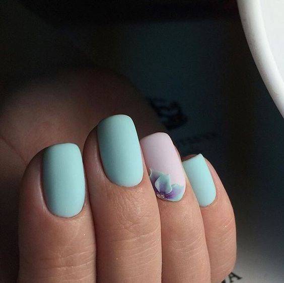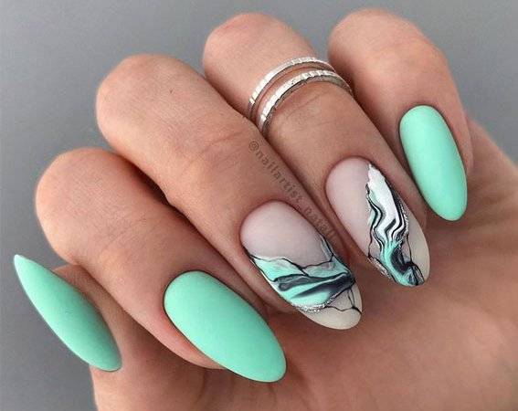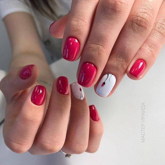 Стандартный однотонный маникюр с выделением другим цветом одного/двух пальцев. При удачном подборе цветов такой дизайн будет вне конкуренции.