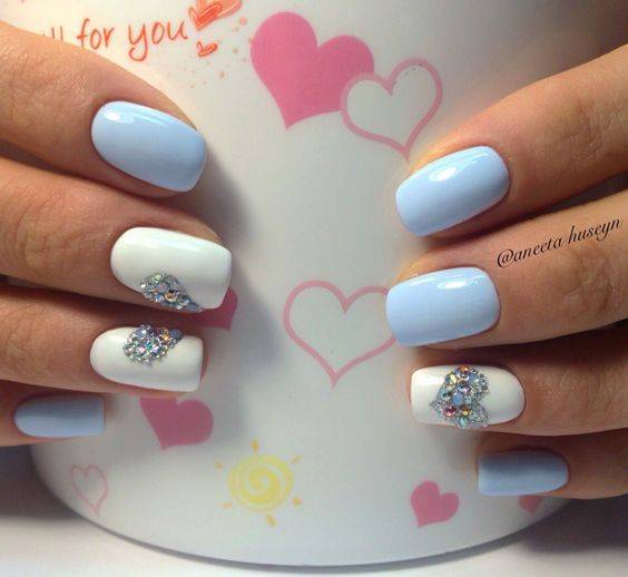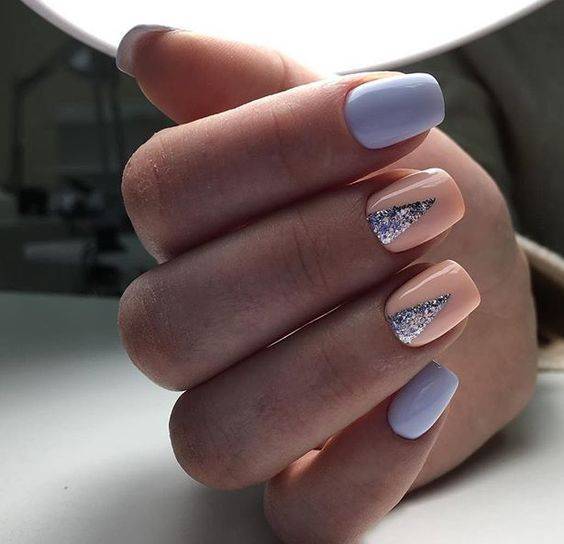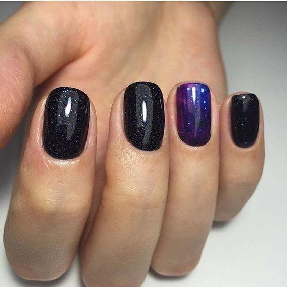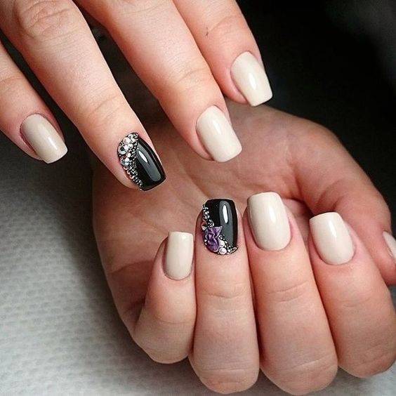 Для ежедневного образа подойдут пастельные оттенки. При необходимости другим цветом можно выделить ноготь на одном из пальцев одной или обеих рук. Классический вариант — черно-белый маникюр с блестками. Акцентный ноготь на руке можно декорировать блестками.