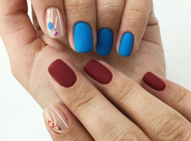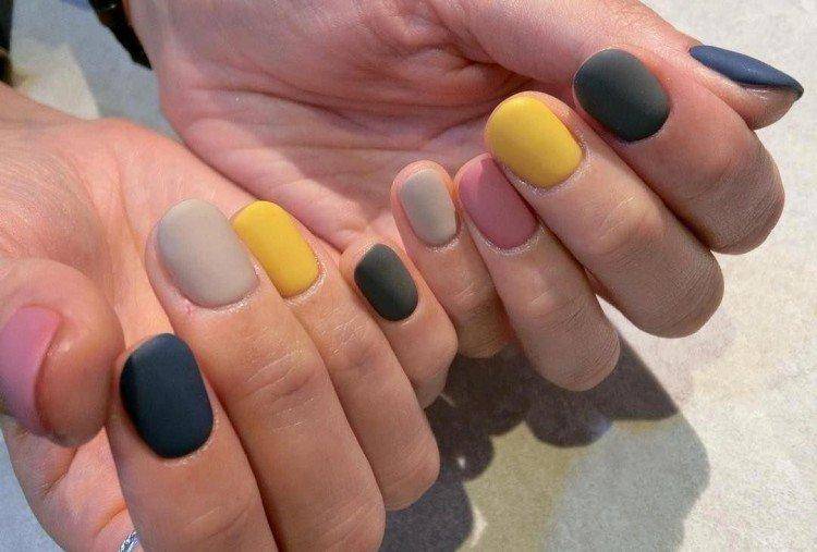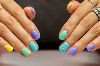 Существует несколько вариантов оформления. Самый неожиданный вариант — покрыть каждый ноготь на обеих руках отдельным цветом. Это могут быть яркие цвета, как светофор или спокойные пастельные оттенки. Пальцы одной руки можно покрыть лаком одного цвета, а второй — другого. Стразы, украшения, декор в данном случае будут как нельзя кстати.