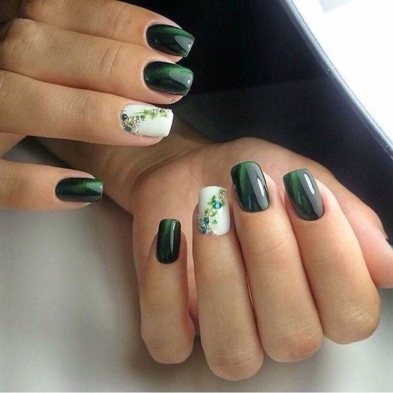При нанесении лака на разные руки можно выбрать один цвет за основу, а два оставшихся использовать для нанесения рисунка. В качестве третьего цвета можно использовать блестки, стразы.
