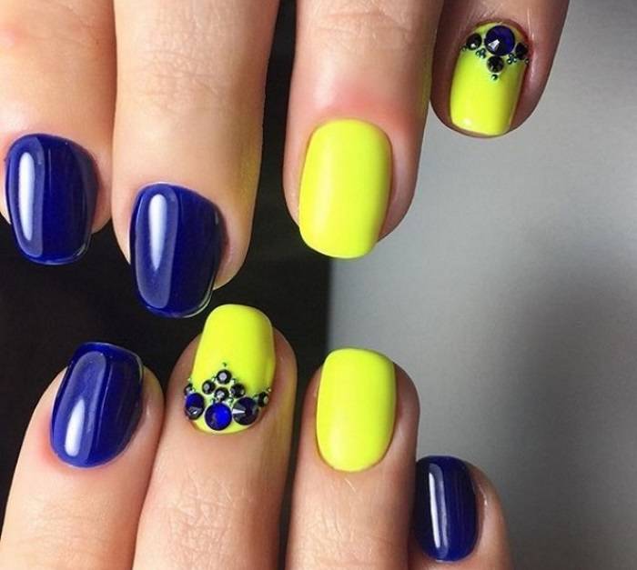 Насыщенный сине-жёлтый маникюр, декорированный стразами