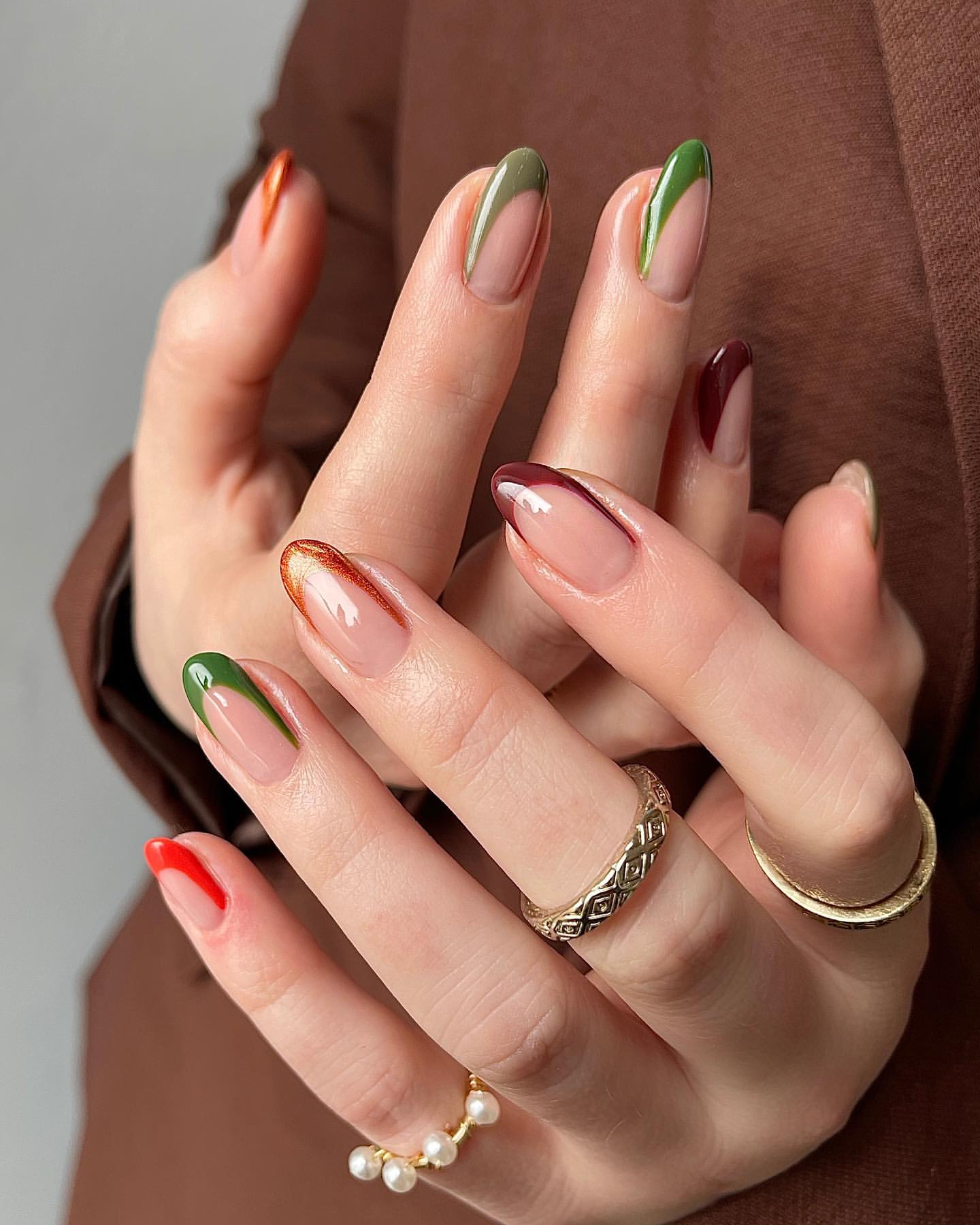 Классическое исполнение дизайна «французский маникюр» уже не актуально. В 2024 году нейл мастера предпочитают использовать яркую цветовую гамму во время выполнения стандартного дизайна. Французский маникюр можно сделать с разными оттенками на каждом пальце или выбрать два цвета, чтобы две руки отличались друг от друга. Уместным и верным решением для радужного французского маникюра будет использовать следующую палитру: красный + зеленый + желтый + оранжевый + синий. Эта комбинация лучше всего подойдет к летнему сезону, когда наш гардероб и аксессуары также имеют яркие цвета. Разноцветный французский маникюр можно сделать, как на коротких, так и на длинных ногтях различной формы. Допустим, для разноцветного френча на ногтях миндалевидной формы подойдет следующая цветовая комбинация:
