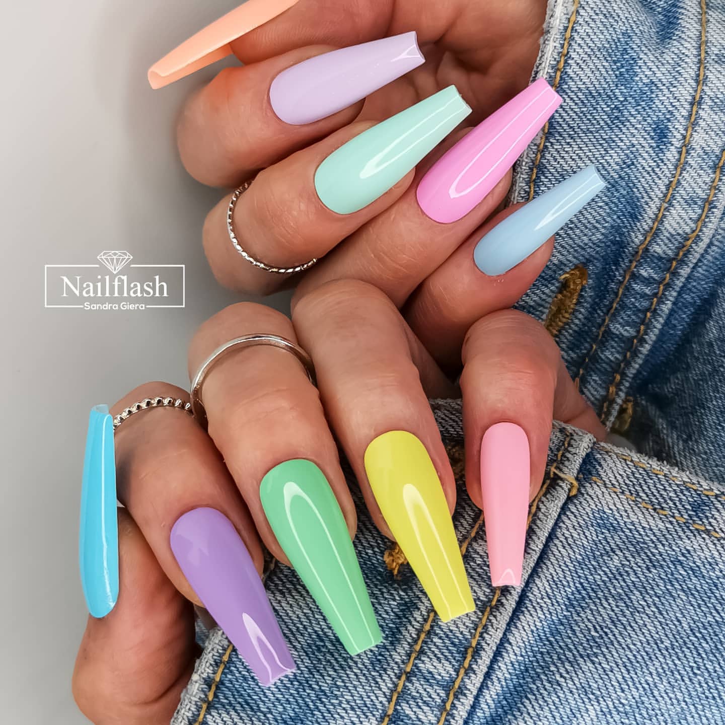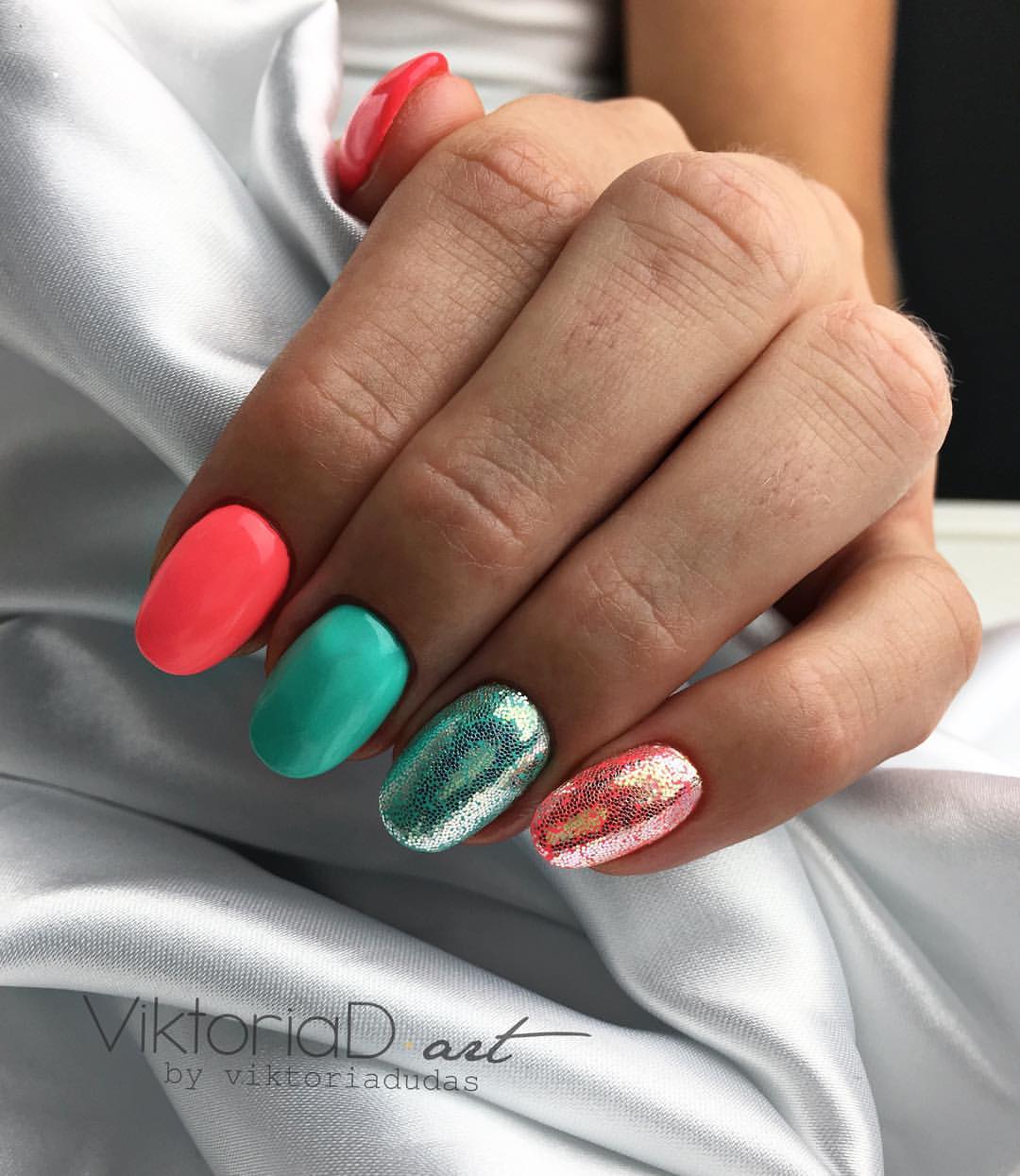 Существует несколько вариантов оформления. Самый неожиданный вариант — покрыть каждый ноготь на обеих руках отдельным цветом. Это могут быть яркие цвета, как светофор или спокойные пастельные оттенки. Пальцы одной руки можно покрыть лаком одного цвета, а второй — другого. Стразы, украшения, декор в данном случае будут как нельзя кстати.