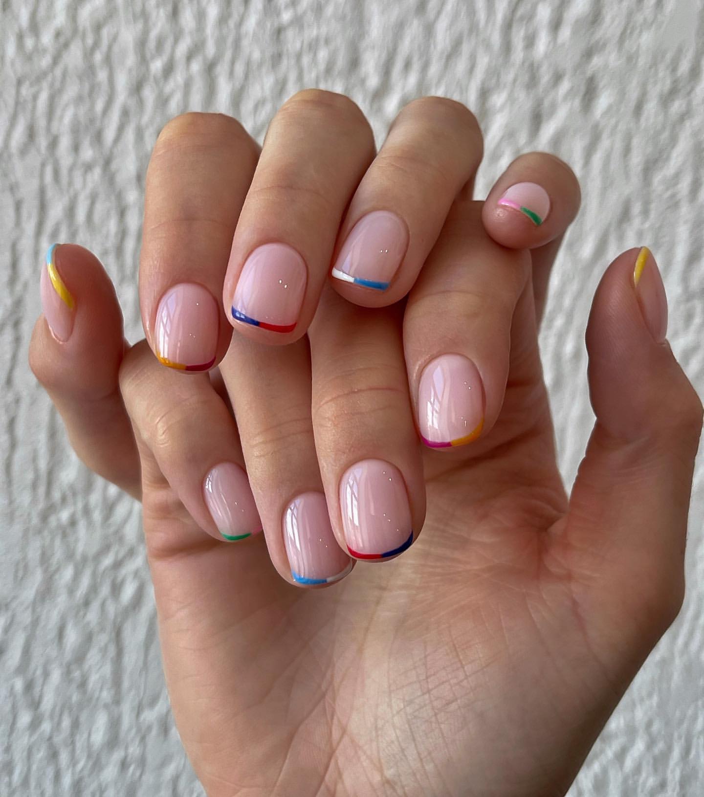 Чтобы современный французский маникюр имел совершенно новый вид, яркие цвета можно расположить на нейтральном белом, а не молочном или нюдовом цвете.