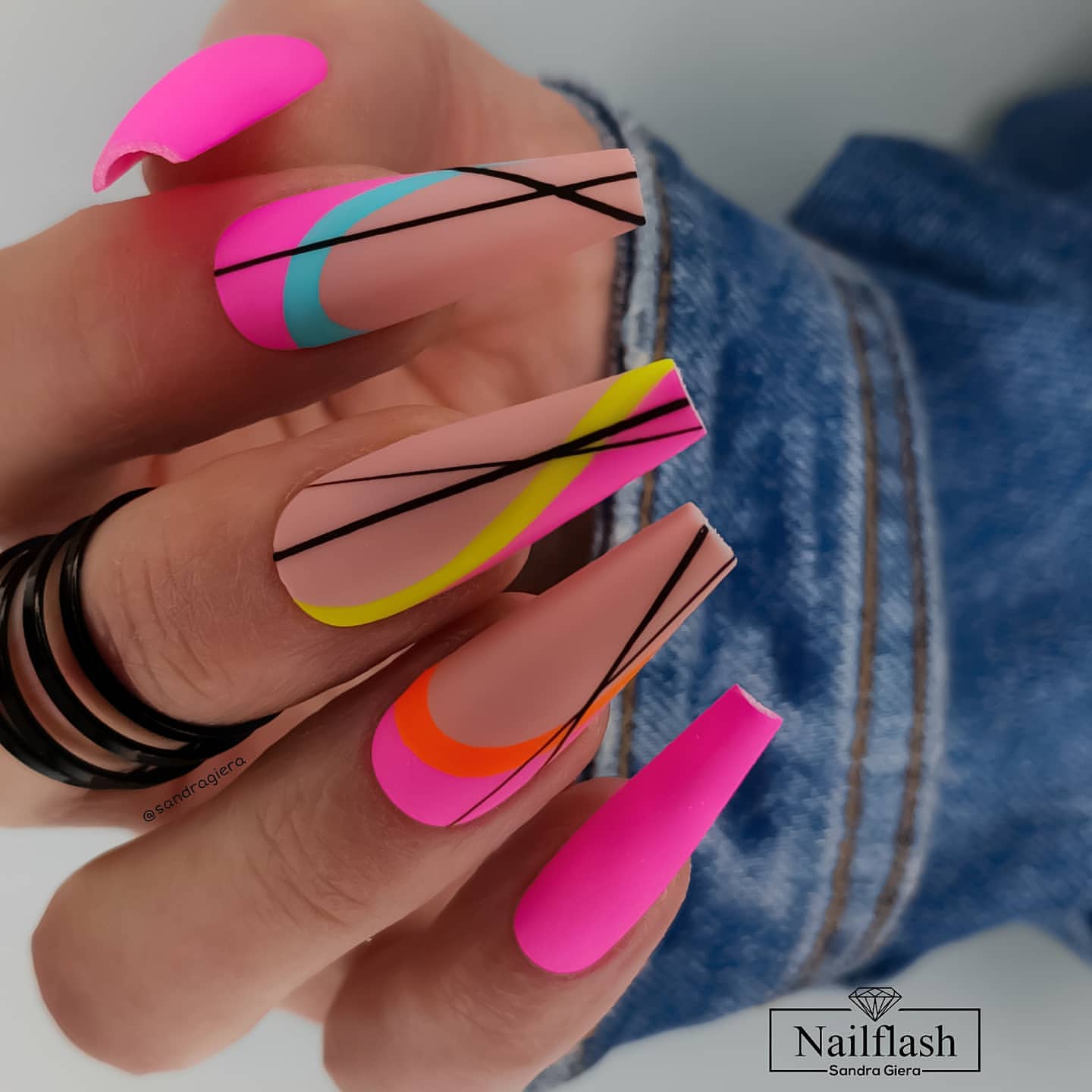 Сделать разноцветный маникюр максимально интенсивным по яркости помогут неоновые лаки. Рационально использовать специальный неоновый топ, с помощью которого любой нанесенный на ноготь цвет лака станет неоновым.