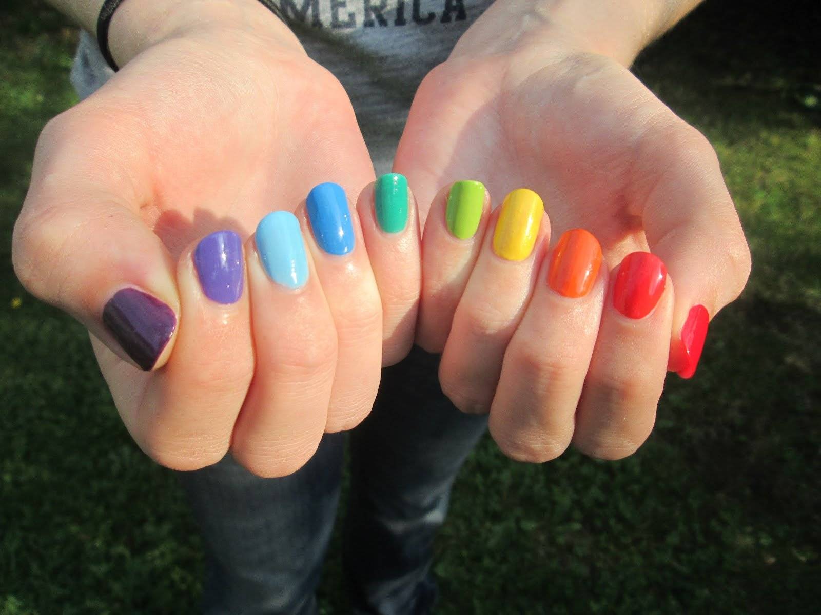 Наиболее простым вариантом создания необычного нейл-арта является маникюр радуга, в котором природное явление простирается с большого пальца и доходит до мизинца. Для получения плавного перехода на каждый ноготь наносится два оттенка, считая от большого пальца.