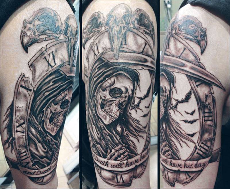 В наше время тату смерти с косой значение может иметь разное. Во многом оно зависит от региона проживания, вероисповедания человека, его принадлежности к определенным субкультурам. Все мы понимаем, что любитель тяжёлой музыки вряд ли хочет на самом деле в ад, слушая Highway to Hell. Соответственно и наколка смерть с косой не связана с его суицидальными наклонностями. Вообще, мужские тату часто делаются намеренно суровыми и брутальными, демонстрируя внутреннюю силу и смелость человека, его бесстрашие перед неминуемой для каждого кончиной.
