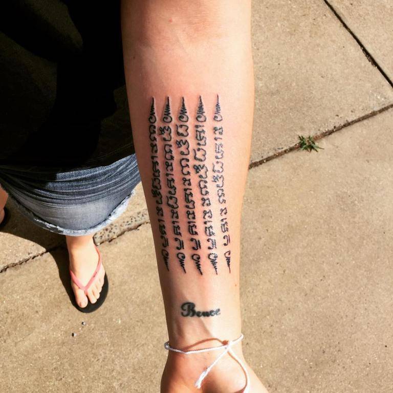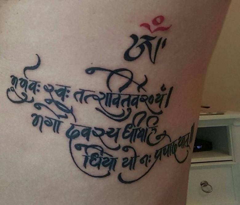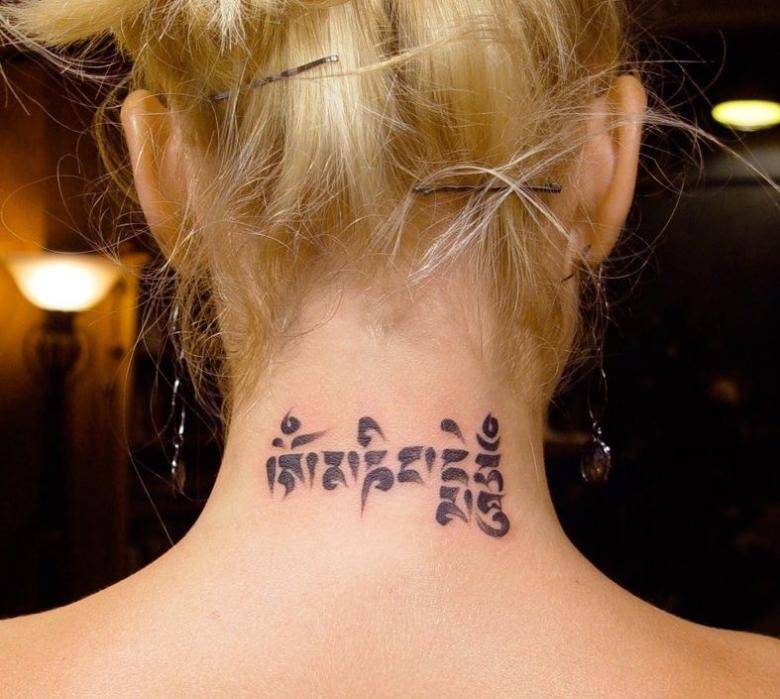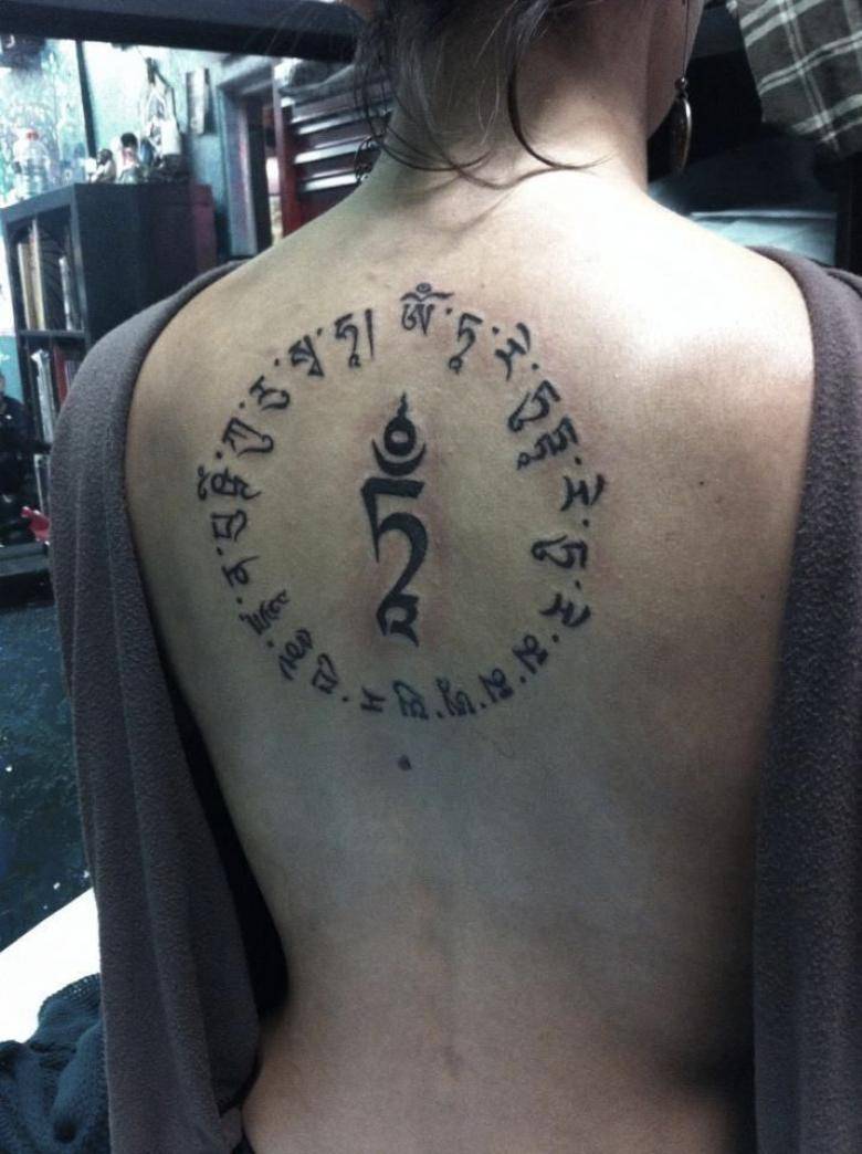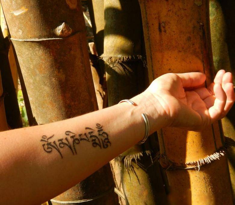 Отдельно стоит сказать об изображении мантр. Наиболее популярной в этом ряду является короткая мантра Ом. Хотя встречаются варианты нанесения более длинных текстов, выбор которых будет зависеть исключительно от предпочтений носителя.