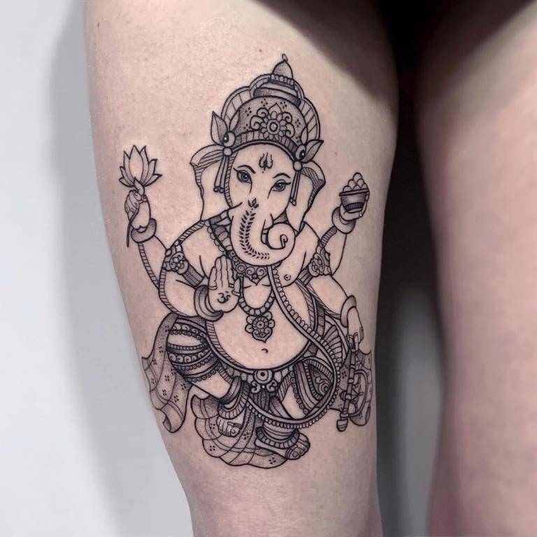 Его большая голова слона означает интеллект, а изогнутое тело – силу и чувства. Как правило, человек набивает буддийское тату Ганешы, когда ему необходима удача и успех в начинаниях.