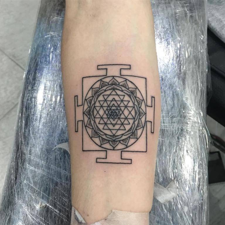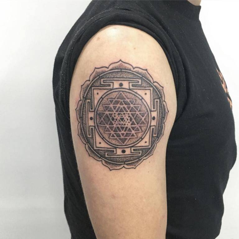 Татуировка Шри Янтра относится к сакральной геометрии и является диаграммой индийской богини счастья, красоты и любви Лакшми, также называемой Шри.