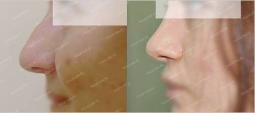 Выровнять искривленную спинку носа без операции невозможно. Ринопластика инъекциями дает возможность только замаскировать дефект. Например, коррекцию курносого носа (с низкой переносицей и приподнятым кончиком) делают путем введения филлеров по всей поверхности спинки носа до самого кончика.