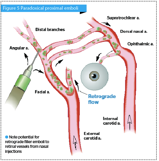 Слепота как вторичное осложнение по причине внутрисосудистой инъекции с ретроградным потоком, приводящей к окклюзии сосудов сетчатки, описана в опросе, проведенном Каррутерсом и группой ученых (Carruthersetal).