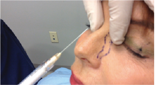 Рисунок 4. Механическое давление на ангулярные сосуды при инъецировании в область носа для предотвращения ретроградной эмболии