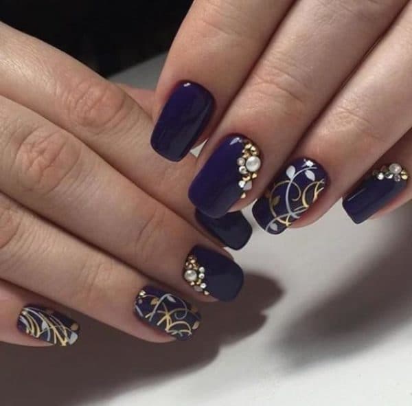 Рассматривая модные блоги бьюти – мастеров, можно сделать вывод, что зимой 2020 пальму первенства перехватит глубокий синий цвет. Его можно будет сочетать с серебристыми или золотистыми узорами, стразами или бусинками.