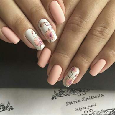 Сложно представить декор без цветочной композиции. Это, пожалуй, самый востребованный дизайн среди модных современниц. Особый шик – акварельные тона. Поэтому поклонницы маникюра с цветами могут смело украсить свои ногти веткой сакуры.