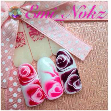 - Материал для выполнения рисунка должен быть таким же жидким, как и фон. Если гель-лак густоват – добавить немного топа, чтобы разбавить его. Тоненькой кисточкой нарисовать линии, имитируя лепестки роз. Они должны закругленными, а местами слегка угловатыми, как на настоящем цветке.