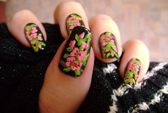 Покрыть ногти базой и 1-2 слоями нежного лака. С помощью тонкой кисти контрастным цветом краски нарисовать тонкие и изогнутые веточки, начиная от кутикулы и доводя до кончика ногтя