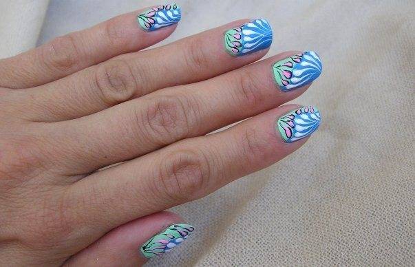 Остальные покрывают несложным узором. Перед покраской ногтя необходимо в обязательном порядке дождаться, пока высохнет предыдущий. После того, как рисунок высохнет его закрепляют прозрачным лаком. В противном случае он будет смываться под воздействием воды.