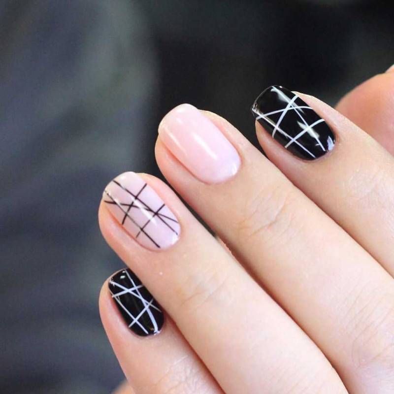 Проще всего сделать на ногтях точки, линии и другие геометрические фигуры. Они могут наноситься упорядочено или хаотично. В самом начале ноготь покрывается базовым цветом. После того, как слой лака подсохнет, при помощи кисточки рисуются линии, а иголкой можно нанести аккуратные точки.