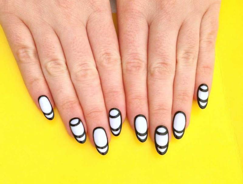 - Не дожидаясь его высыхания, быстро добавьте несколько дугообразных полосок контрастного цвета. А в верхнем углу ногтя поставьте жирную точку.