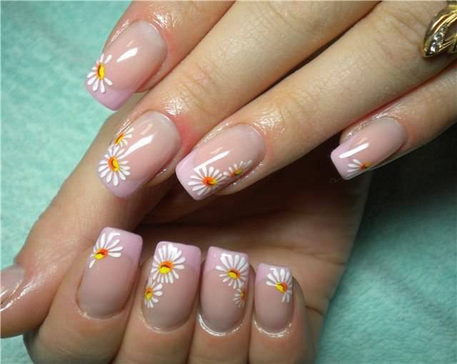 - Затем вновь покройте ногти черным цветом, но уже более тонким слоем и по нему осуществите роспись, в виде ромашек, применяя белый и желтый цвета покрытий. Высушивайте готовый дизайн под лампой в течение 45 секунд.