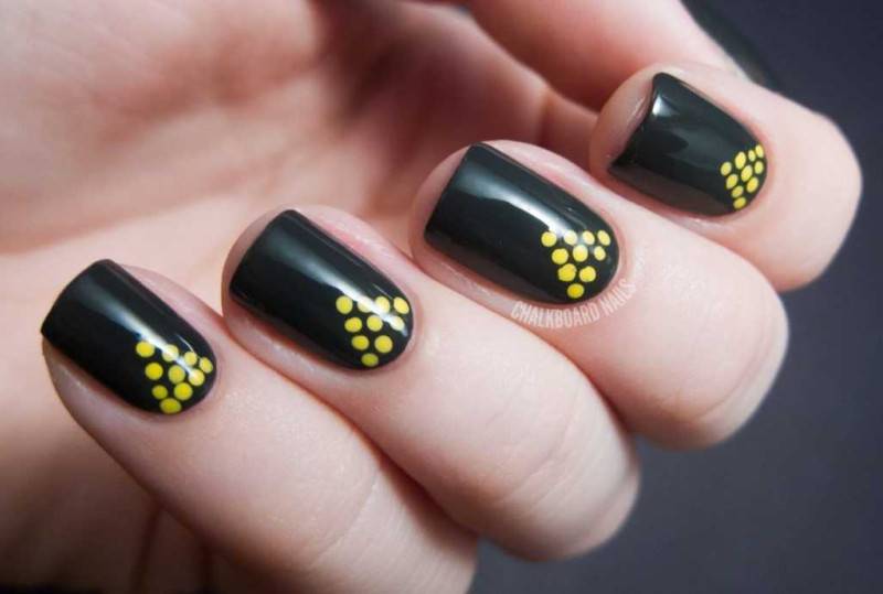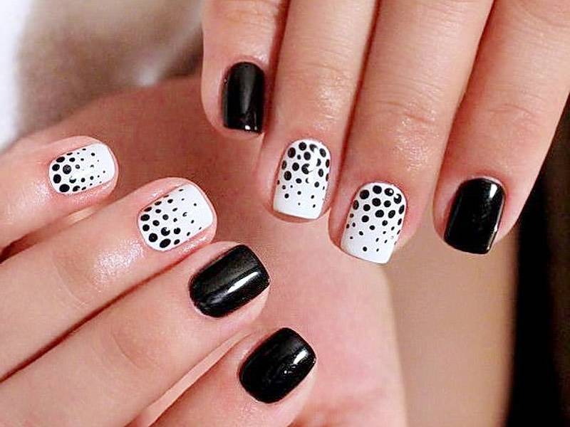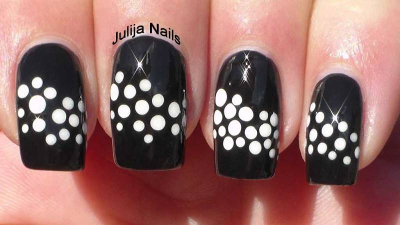 - На основном черном цвете, выполните точечные рисунки белым лаком. Можно разбавить белые пятна точками розового оттенка. Размер кружочков, выбирается исходя из вкусов. Главной составляющей эффектности будет частота расставления точек, чем гуще они будут проставлены, тем симпатичней выйдет маникюр.