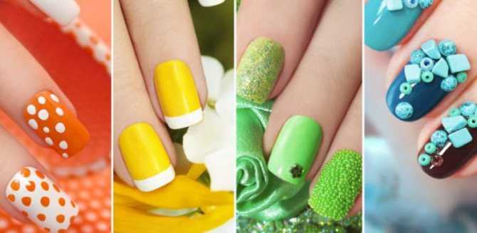Такой способ нанесения не займет много времени, не вызовет особых сложностей процесса, зато смотреться будет впечатляюще. Понадобится дотс с мелким шариком и гель-лак пестрых и выразительных оттенков, выбрать можно исходя из собственных предпочтений или соответствующе стилю одежды: