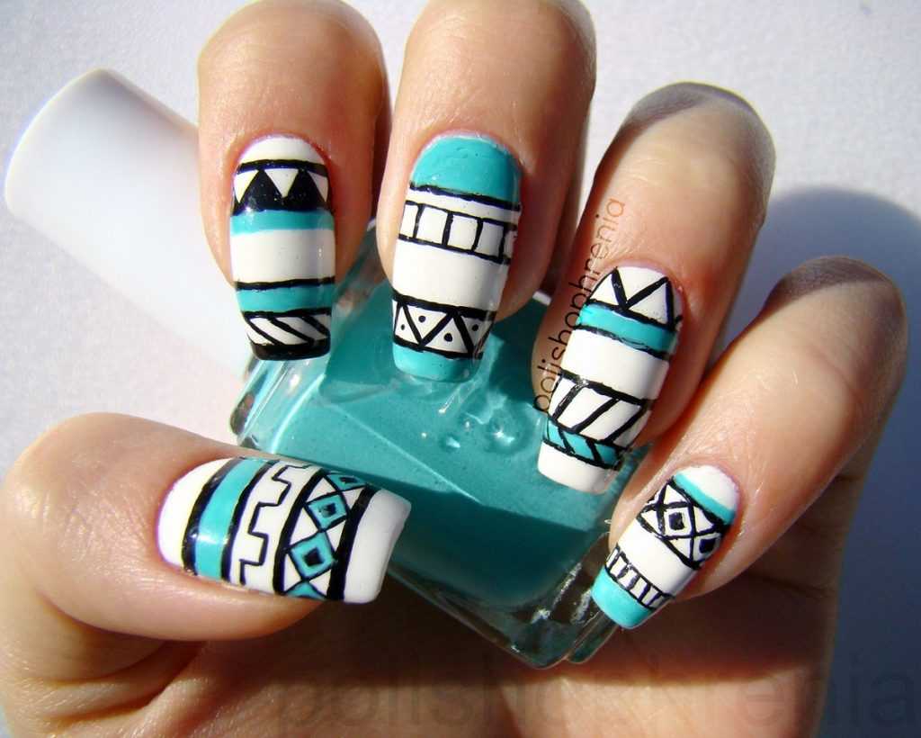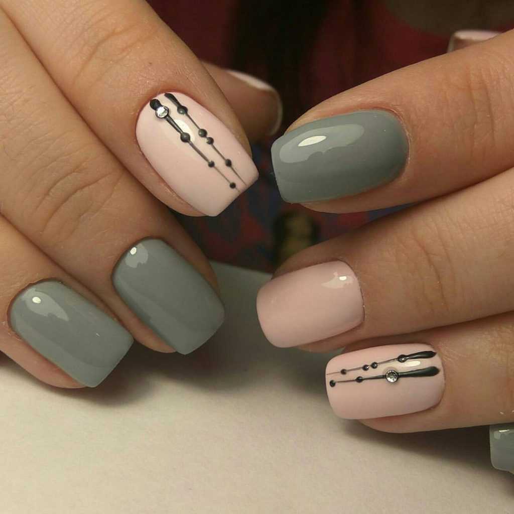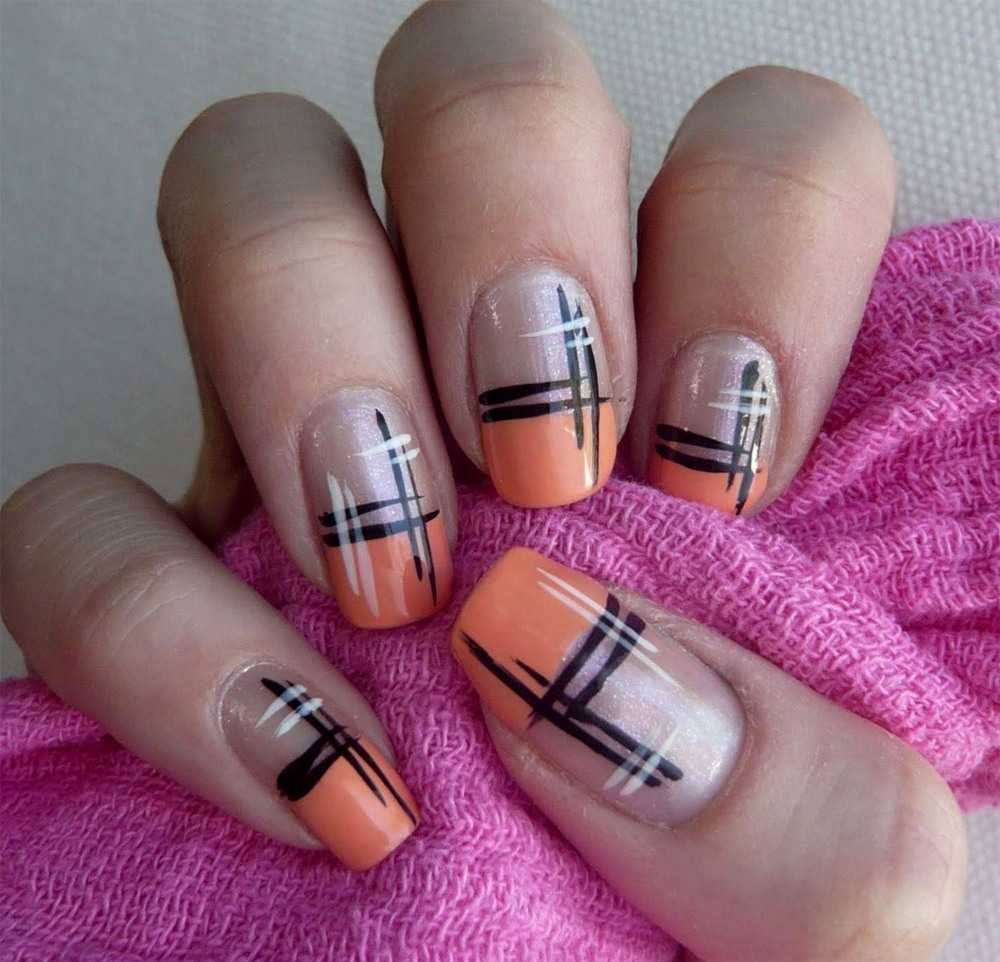 Проще всего сделать на ногтях точки, линии и другие геометрические фигуры. Они могут наноситься упорядочено или хаотично. В самом начале ноготь покрывается базовым цветом. После того, как слой лака подсохнет, при помощи кисточки рисуются линии, а иголкой можно нанести аккуратные точки.