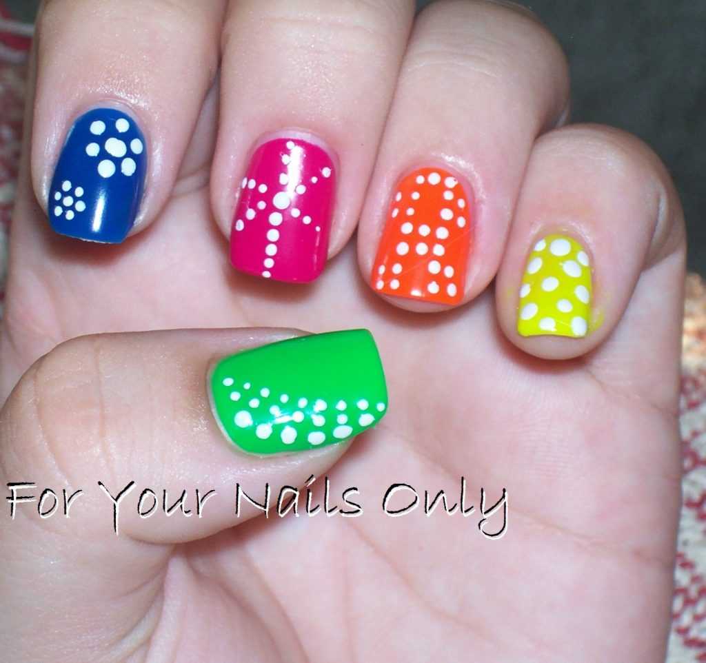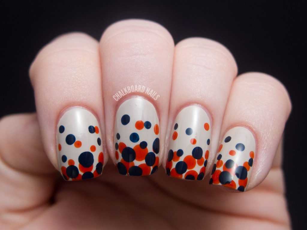 Такой способ нанесения не займет много времени, не вызовет особых сложностей процесса, зато смотреться будет впечатляюще. Понадобится дотс с мелким шариком и гель-лак пестрых и выразительных оттенков, выбрать можно исходя из собственных предпочтений или соответствующе стилю одежды: