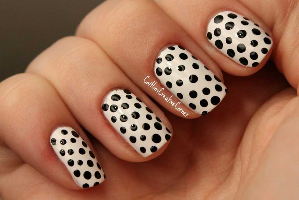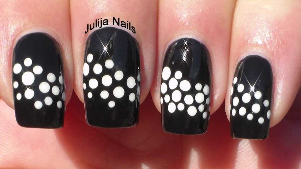 - На основном черном цвете, выполните точечные рисунки белым лаком. Можно разбавить белые пятна точками розового оттенка. Размер кружочков, выбирается исходя из вкусов. Главной составляющей эффектности будет частота расставления точек, чем гуще они будут проставлены, тем симпатичней выйдет маникюр.