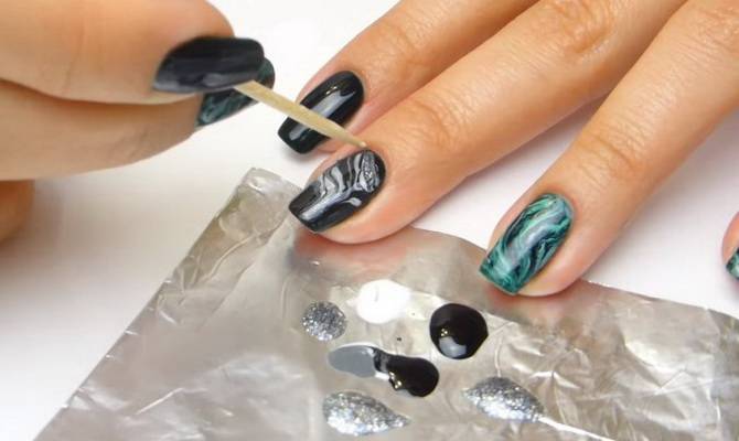 Ещё один весьма простой вид нейл-арта. Для него используют 3-4 разноцветных лака. На основное покрытие наносятся капли разного цвета. Затем с помощью зубочистки им придается произвольная форма клякс.