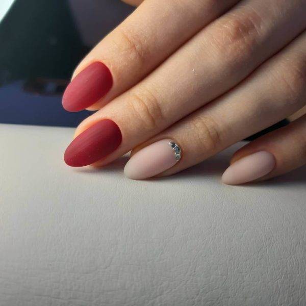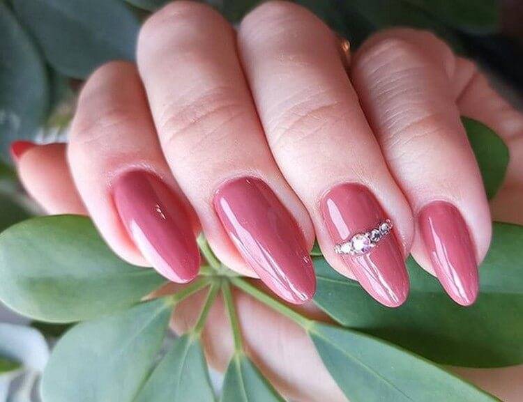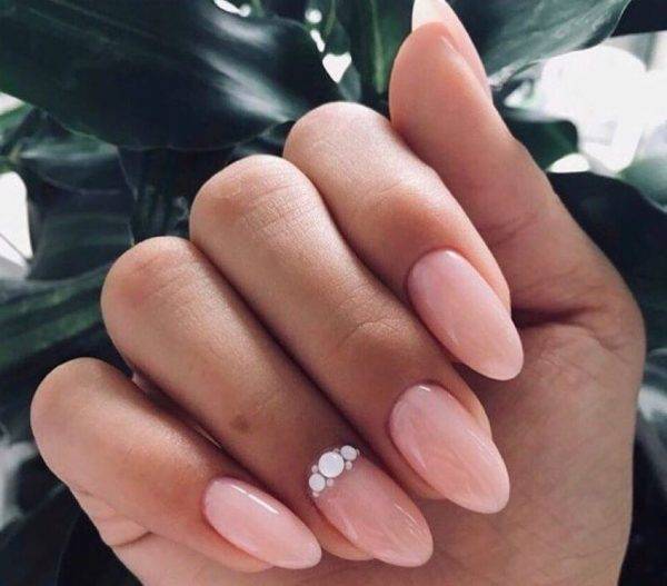Полюбившийся многим дизайн со стразами прост в выполнении и подойдет новичкам. После нанесения фона выложи стразы в форме кольца на ноготь безымянного пальца