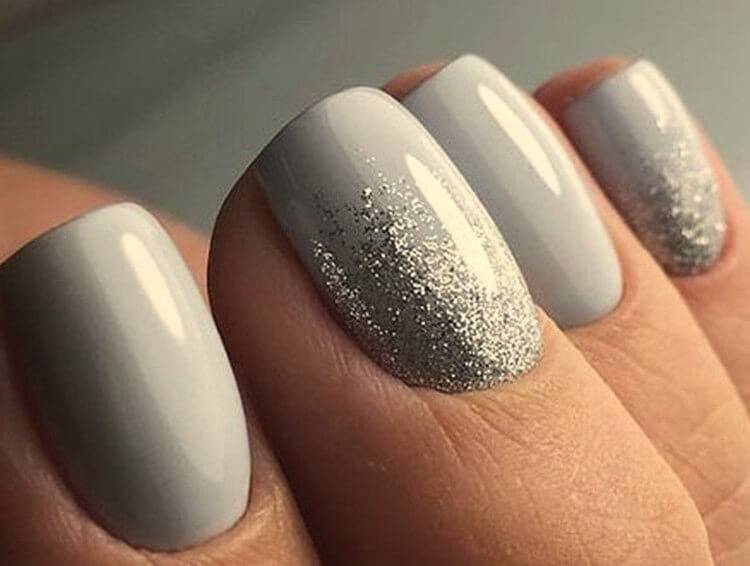 На коротких ногтях однотонные нейтральные дизайны смотрятся еще выразительнее, если подчеркнуть цвет блестками. На фото они растянуты в технике градиента от основания к краю. Пластина визуально удлиняется за счет размытых линий и блеска. Сделать маникюр легко, используя кисточку и мелкие блестки с прозрачной основой. Еще много идей однотонного маникюра.