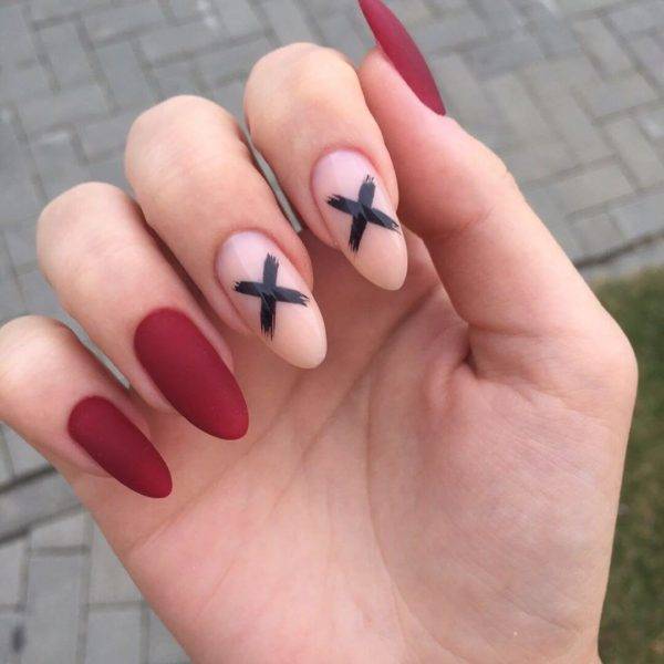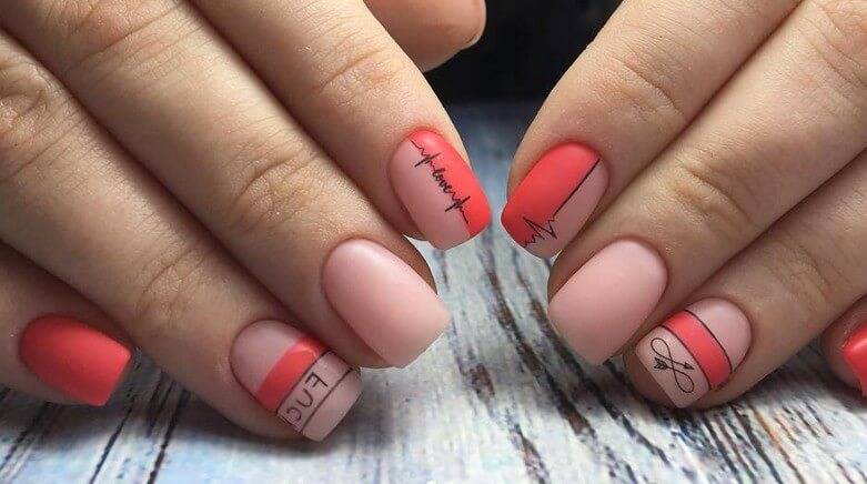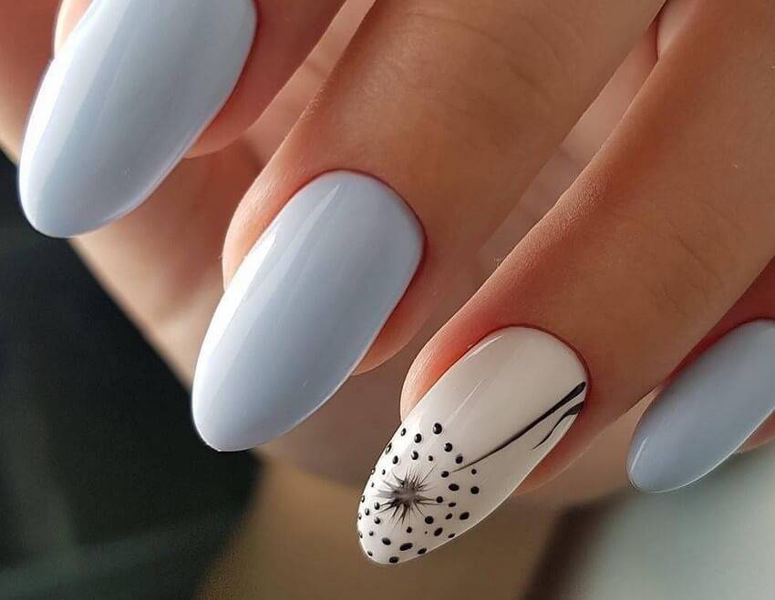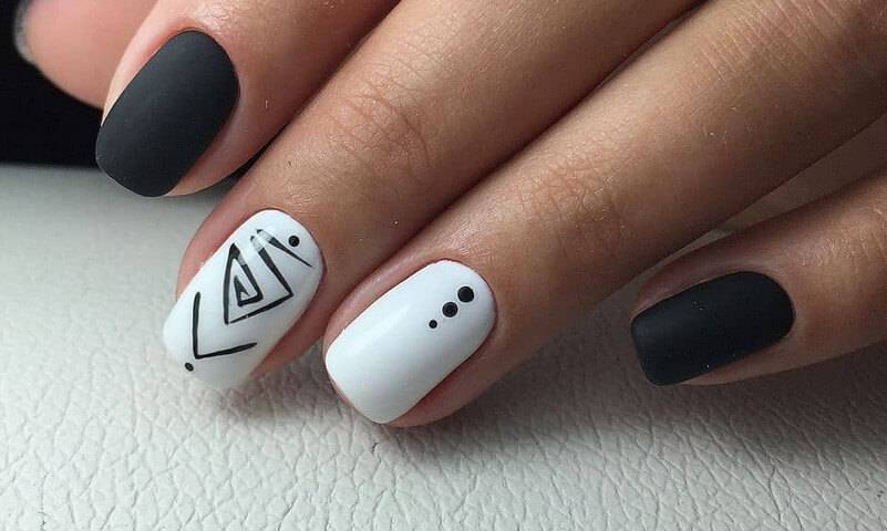 Если тебе сложно красиво рисовать композиции при нанесении дизайна, используй мелкую графику. Ломанные линии, точки, кляксы – всё будет смотреться красиво в контрастных черно-белых и других тонах. Используй тонкую кисточку, чтобы графика получилась аккуратной. Этот дизайн подойдет и на маленькие ногти.