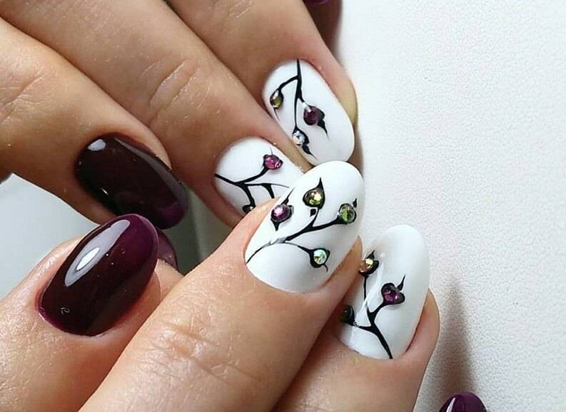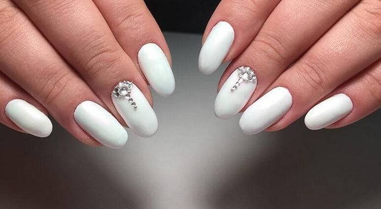 Дизайн освоит и новичок. Наносим фоновое покрытие любого оттенка, на фото это белый цвет, и дополняем композицией из цветных или однотонных золотистых, серебристых страз. Простое сочетание цвета и блеска подойдет для вечерних образов. Про стразы большое руководство по применению.