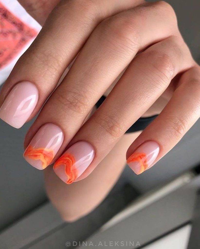 Хотите весьма оригинальный маникюр иголкой? Тогда нарисуйте на ногтях пламя. Основа делается в двух тонах — низ ногтевой пластины в одном цвете, а верх — в другом. А на стыке иглой рисуются огоньки — язычки пламени.