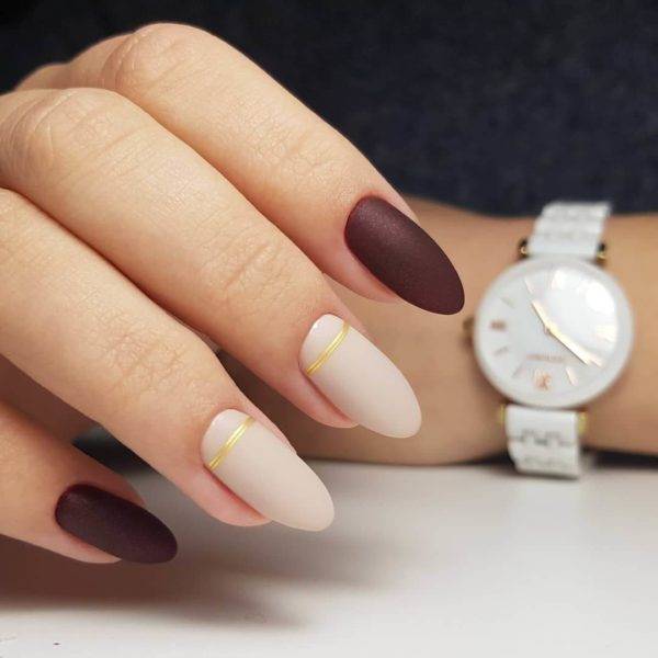 Для такого рисунка необходим темный и светлый лак, в идеале — черный и белый, но подойдут и любые другие контрастные оттенки. Ногтевую пластину условно разделяем на две равные части вертикальной линией и красим их кисточкой.