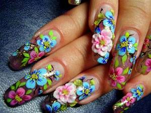 Для того чтобы изображение на ноготке стало объемным, используется специальная пудра из акрила — так создается пластичный материал, из которого можно создавать лепестки, листики, ракушки и многое другое. Выполненные элементы будут немного выступать над поверхностью ноготка, поэтому, само собой, для повседневного применения такой дизайн вряд ли подойдет. Но вот для того, чтобы блеснуть роскошным маникюром на приеме, торжественном вечере или дружеской вечеринке, этот прием ногтевого дизайна будет как нельзя кстати. Создавать объемные акриловые композиции под силу только достаточно опытным мастерам, но ведь опыт – дело наживное, не правда ли?